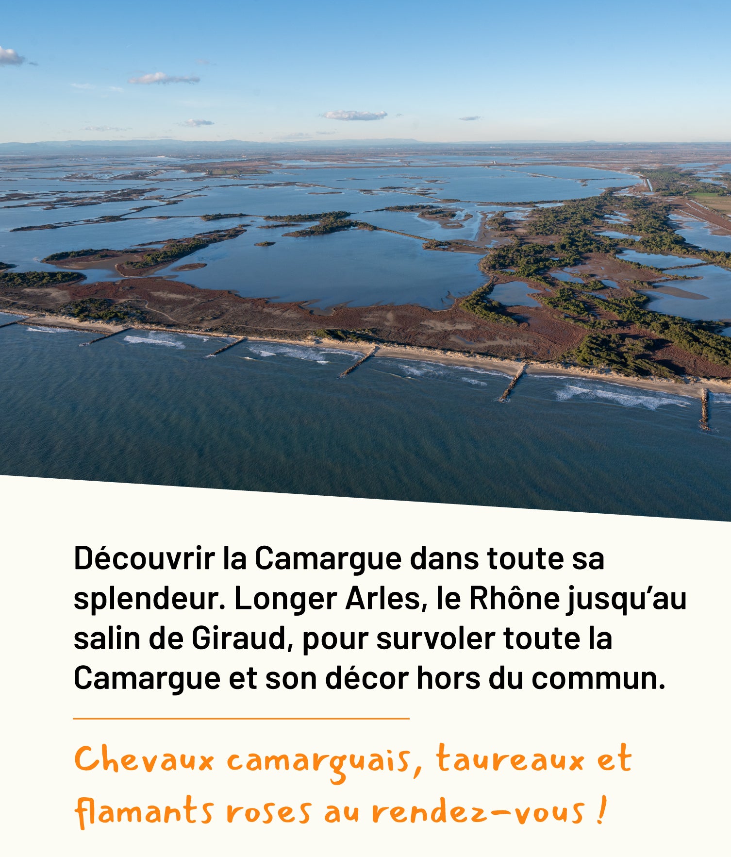 Au programme : découvrir la Camargue dans toute sa splendeur. Longer Alès, le Rhône jusqu’au salin de Giraud, pour survoler toute la Camargue et son décor hors du commun