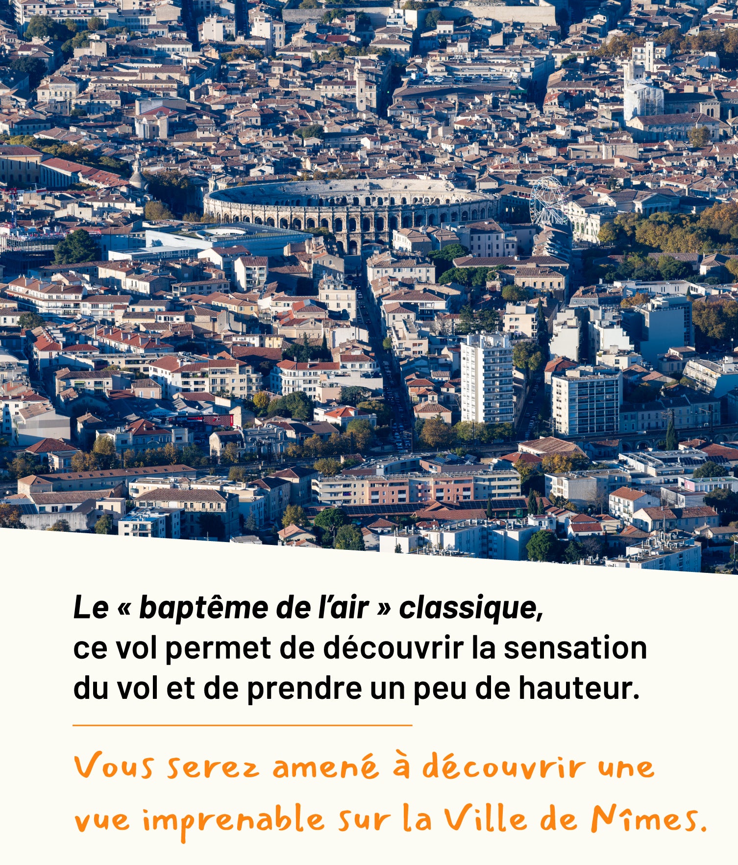 Ce vol permet de découvrir la sensation du vol et de prendre un peu de hauteur. Vous serez amené à découvrir une vue imprenable sur la Ville de Nîmes.*